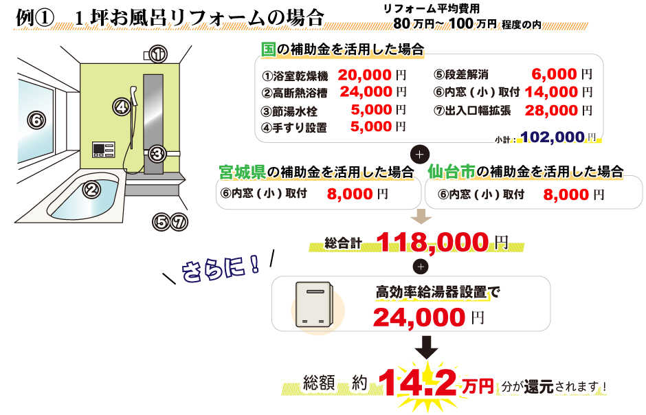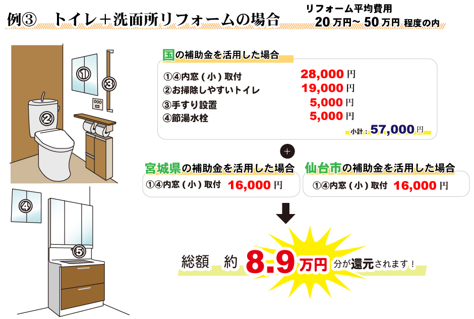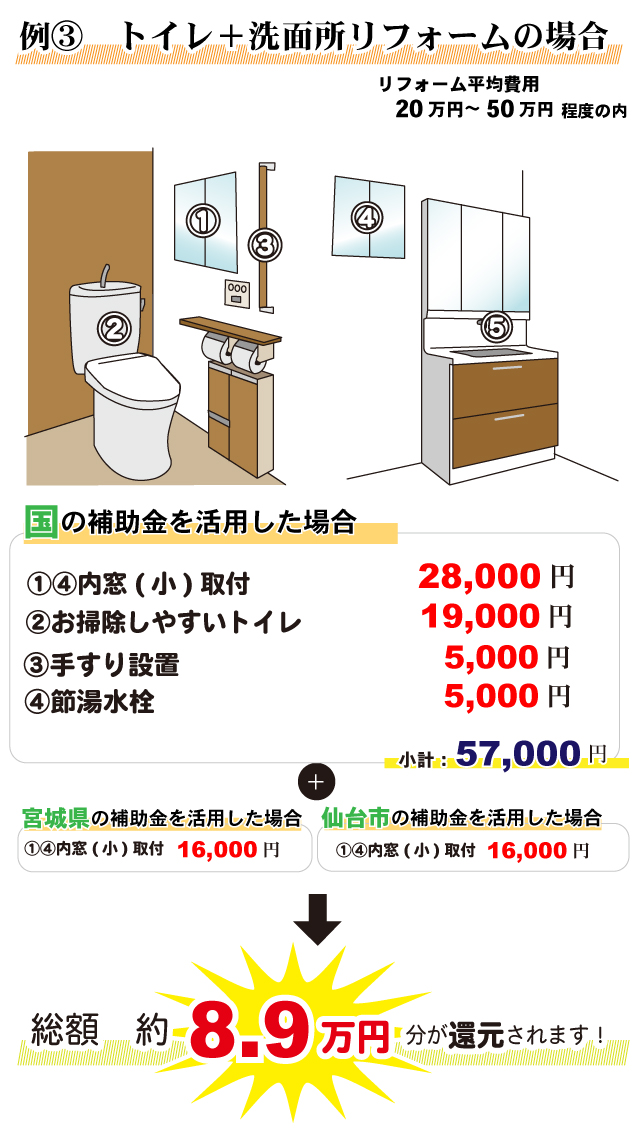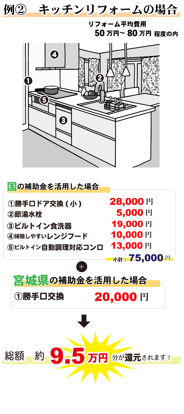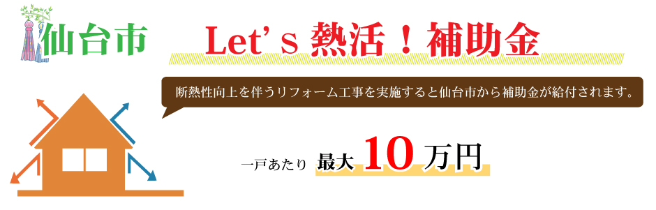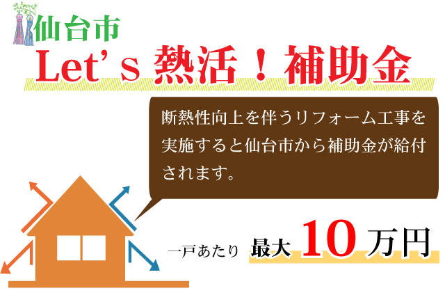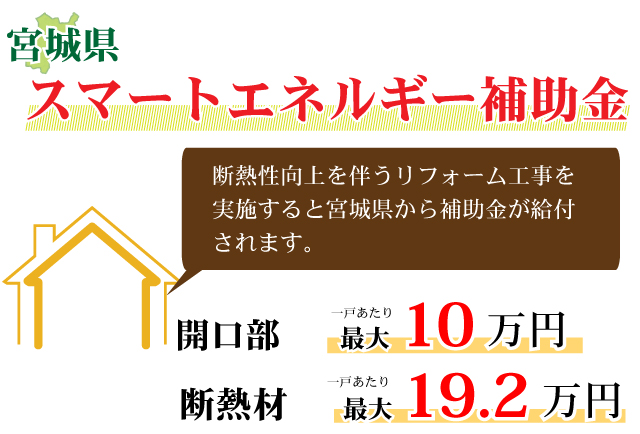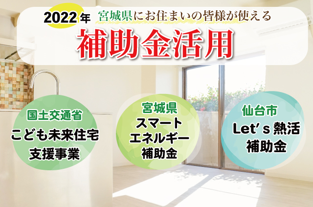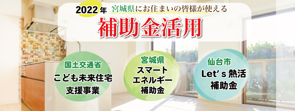無料見積り・相談 電話で見積り・相談 0120-705-582 【受付】9:00~18:00【定休日】水曜日 電話で見積り・相談 HOME2022年補助金のご案内 国や宮城県、仙台市等各自治体から対象のリフォームをすると補助金を受け取ることができます。サンダイホームでは補助金を活用したリフォームの実績多数!ご興味がある方はお気軽にお問合せください。 2022年 活用できる主な補助金 交付申請期限 2021/11/26(金)~2023/3/31(金)※予算なくなり次第終了となるので詳細は担当にお尋ねください。※期間が延長されました。 対象工事 節水型トイレ、節湯水栓、高断熱浴槽、高効率給湯器、断熱改修工事(窓、ドア、外壁、屋根、 天井又は床)等 ※最低補助金額5万円(税込)以上が条件となります。 補助金額 一戸あたり 最大30万円 対象者 申請者が所有している住宅で対象必須工事を実施 受付期間 一次募集 2022/5/16(月)~5/27(金) 二次募集 2022/8/29(月)~9/9(金) 三次募集 2022/11/28(月)~12/9(金)※各募集区分の申請総額が予算額を上回った場合は、抽選により交付対象者を決定いたします。 対象工事 内窓、サッシ交換、ガラス交換、ドア交換、天井・壁・床断熱材等 補助金額 開口部 一戸あたり 最大10万円 断熱材 一戸あたり 最大19.2万円 対象者 宮城県内の住宅で申請者が所有&居住している住宅(賃貸住宅は対象外) ※詳細は担当にお尋ねください 申請期間 2022/4/1(金)~2023/1/31(火)※予算なくなり次第終了となるので詳細は担当にお尋ねください 対象工事 内窓、サッシ交換、ガラス交換等 補助金額 一戸あたり 最大10万円 対象者 申請者が仙台市在住で所有または居住している住宅 ※詳細は担当にお尋ねください 2022年 大規模リフォーム向け補助金 申請期間 2022/5/9(月)~2022/12/23(金)※予算なくなり次第終了となるので詳細は担当にお尋ねください 対象工事 内窓、サッシ交換、ガラス交換、断熱材、劣化対策、バリアフリー等※事前のインスペクション必須 ※国の補助金同士の併用は原則不可 補助金額 一戸あたり 最大100万円(補助率1/3) ※三世代同居対応改修工事を実施する場合や、若者・子育て世帯又は既存住宅の購入者がリフォームを行う場合は最大150万円(補助率1/3) 対象者 申請者が所有している住宅で対象必須工事を実施 ※詳細は担当にお尋ねください 補助金活用例 お問い合わせ サンダイホームでは補助金を活用したリフォームの実績多数!ご興味がある方はお気軽にお問合せください。 各種お問い合わせ 住まいのお悩み相談はこちらから 電話で相談する 自宅から相談する すぐにお悩みを解決 リフォームで最後までサポート WEBで相談する WEBから気軽に相談可能 オンライン相談も可能! 現状調査や見積もり依頼にも対応 ショールームで相談する 実際の商品を見ながら確認が可能 資料と合わせて説明を聞くことが可能 実際のリフォーム現場が見られる - トップに戻る - サンダイホーム・グループ サンダイ本社 サンダイ本社宮城県仙台市泉区長命ケ丘6-15-10 | 0120-70-5582 泉・青葉ショールーム仙台市泉区長命ケ丘 6-15-10 | 0120-70-5582 宮城野・多賀城ショールーム仙台市宮城野区中野字寺前 68-1 | 0120-70-5582 岩沼・名取ショールーム岩沼市栄町 1-9-1 | 0120-70-5582 営業部 リフォーム・リノベーション・新築仙台市泉区長命ケ丘 6-15-10 | 0120-70-5582 ライフサポート仙台市泉区長命ケ丘 6-15-10 | 0120-70-5582 解体仙台市泉区南中山 2-3-12 | 0120-70-5582 不動産仙台市泉区長命ケ丘 6-15-10 | 0120-70-5582 [統括管理会社]株式会社サンダイホーム|仙台市泉区長命ケ丘6-15-10|022-341-5152 [施工管理会社]株式会社住環境テック|仙台市泉区長命ケ丘6-15-10|022-341-5417