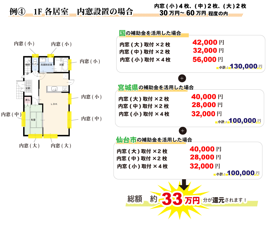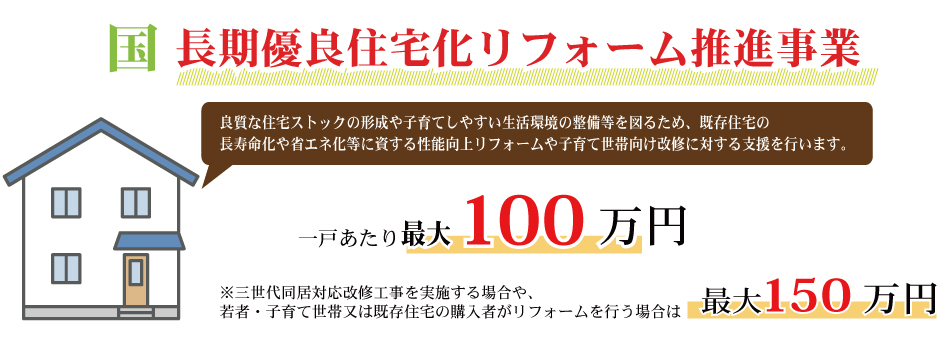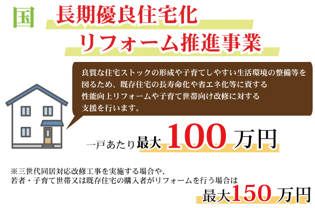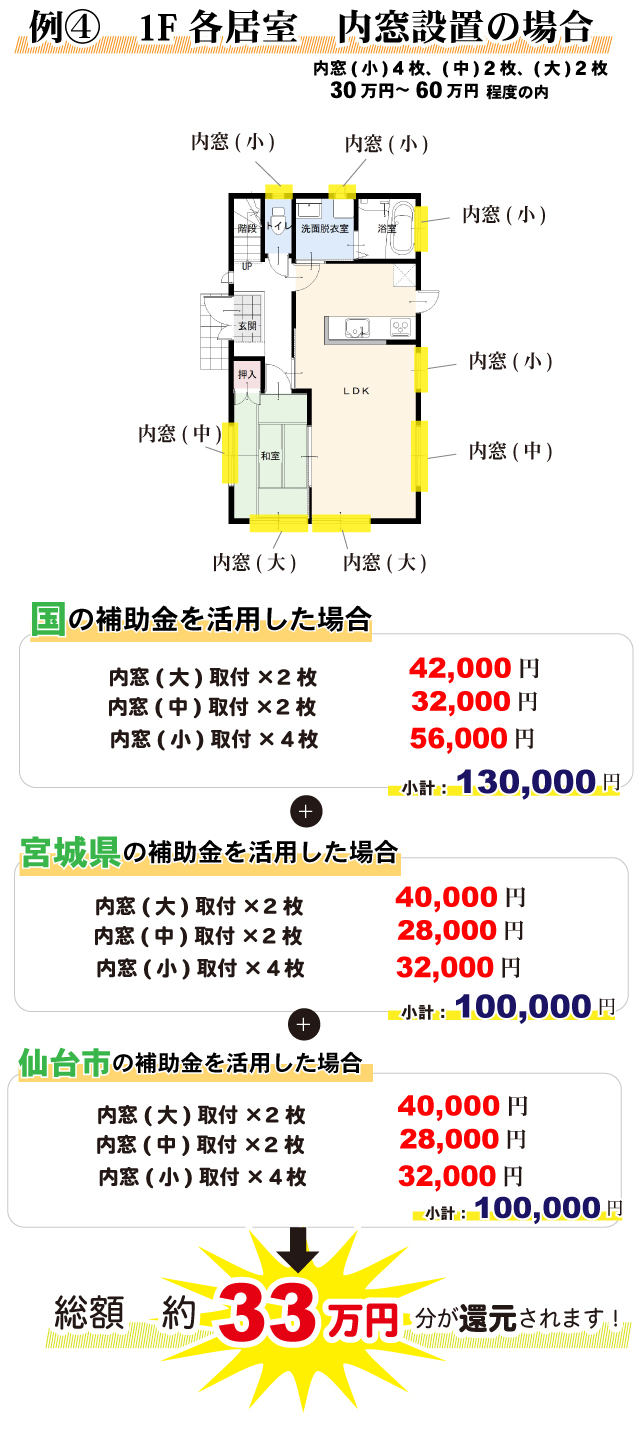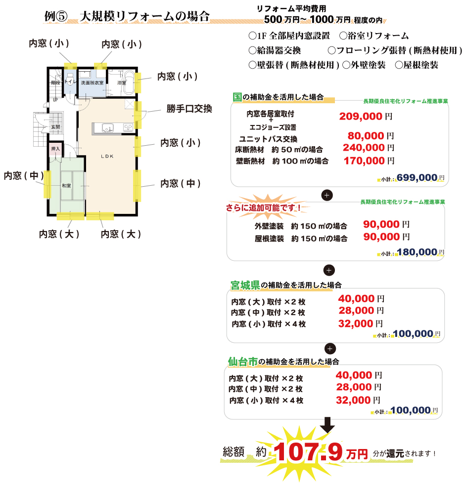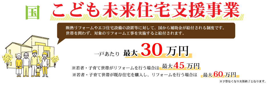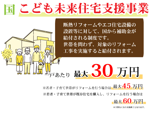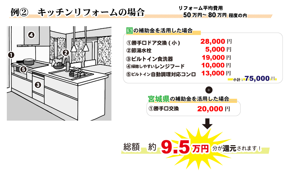 無料見積り・相談 電話で見積り・相談 0120-705-582 【受付】9:00~18:00【定休日】水曜日 電話で見積り・相談 HOME2022年補助金のご案内 国や宮城県、仙台市等各自治体から対象のリフォームをすると補助金を受け取ることができます。サンダイホームでは補助金を活用したリフォームの実績多数!ご興味がある方はお気軽にお問合せください。 2022年 活用できる主な補助金 交付申請期限 2021/11/26(金)~2023/3/31(金)※予算なくなり次第終了となるので詳細は担当にお尋ねください。※期間が延長されました。 対象工事 節水型トイレ、節湯水栓、高断熱浴槽、高効率給湯器、断熱改修工事(窓、ドア、外壁、屋根、 天井又は床)等 ※最低補助金額5万円(税込)以上が条件となります。 補助金額 一戸あたり 最大30万円 対象者 申請者が所有している住宅で対象必須工事を実施 受付期間 一次募集 2022/5/16(月)~5/27(金) 二次募集 2022/8/29(月)~9/9(金) 三次募集 2022/11/28(月)~12/9(金)※各募集区分の申請総額が予算額を上回った場合は、抽選により交付対象者を決定いたします。 対象工事 内窓、サッシ交換、ガラス交換、ドア交換、天井・壁・床断熱材等 補助金額 開口部 一戸あたり 最大10万円 断熱材 一戸あたり 最大19.2万円 対象者 宮城県内の住宅で申請者が所有&居住している住宅(賃貸住宅は対象外) ※詳細は担当にお尋ねください 申請期間 2022/4/1(金)~2023/1/31(火)※予算なくなり次第終了となるので詳細は担当にお尋ねください 対象工事 内窓、サッシ交換、ガラス交換等 補助金額 一戸あたり 最大10万円 対象者 申請者が仙台市在住で所有または居住している住宅 ※詳細は担当にお尋ねください 2022年 大規模リフォーム向け補助金 申請期間 2022/5/9(月)~2022/12/23(金)※予算なくなり次第終了となるので詳細は担当にお尋ねください 対象工事 内窓、サッシ交換、ガラス交換、断熱材、劣化対策、バリアフリー等※事前のインスペクション必須 ※国の補助金同士の併用は原則不可 補助金額 一戸あたり 最大100万円(補助率1/3) ※三世代同居対応改修工事を実施する場合や、若者・子育て世帯又は既存住宅の購入者がリフォームを行う場合は最大150万円(補助率1/3) 対象者 申請者が所有している住宅で対象必須工事を実施 ※詳細は担当にお尋ねください 補助金活用例 お問い合わせ サンダイホームでは補助金を活用したリフォームの実績多数!ご興味がある方はお気軽にお問合せください。 各種お問い合わせ 住まいのお悩み相談はこちらから 電話で相談する 自宅から相談する すぐにお悩みを解決 リフォームで最後までサポート WEBで相談する WEBから気軽に相談可能 オンライン相談も可能! 現状調査や見積もり依頼にも対応 ショールームで相談する 実際の商品を見ながら確認が可能 資料と合わせて説明を聞くことが可能 実際のリフォーム現場が見られる - トップに戻る - サンダイホーム・グループ サンダイ本社 サンダイ本社宮城県仙台市泉区長命ケ丘6-15-10 | 0120-70-5582 泉・青葉ショールーム仙台市泉区長命ケ丘 6-15-10 | 0120-70-5582 宮城野・多賀城ショールーム仙台市宮城野区中野字寺前 68-1 | 0120-70-5582 岩沼・名取ショールーム岩沼市栄町 1-9-1 | 0120-70-5582 営業部 リフォーム・リノベーション・新築仙台市泉区長命ケ丘 6-15-10 | 0120-70-5582 ライフサポート仙台市泉区長命ケ丘 6-15-10 | 0120-70-5582 解体仙台市泉区南中山 2-3-12 | 0120-70-5582 不動産仙台市泉区長命ケ丘 6-15-10 | 0120-70-5582 [統括管理会社]株式会社サンダイホーム|仙台市泉区長命ケ丘6-15-10|022-341-5152 [施工管理会社]株式会社住環境テック|仙台市泉区長命ケ丘6-15-10|022-341-5417
