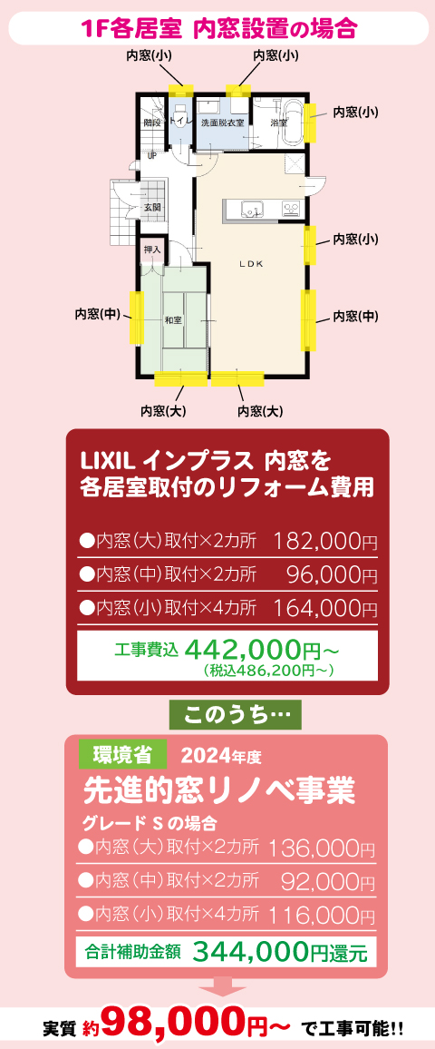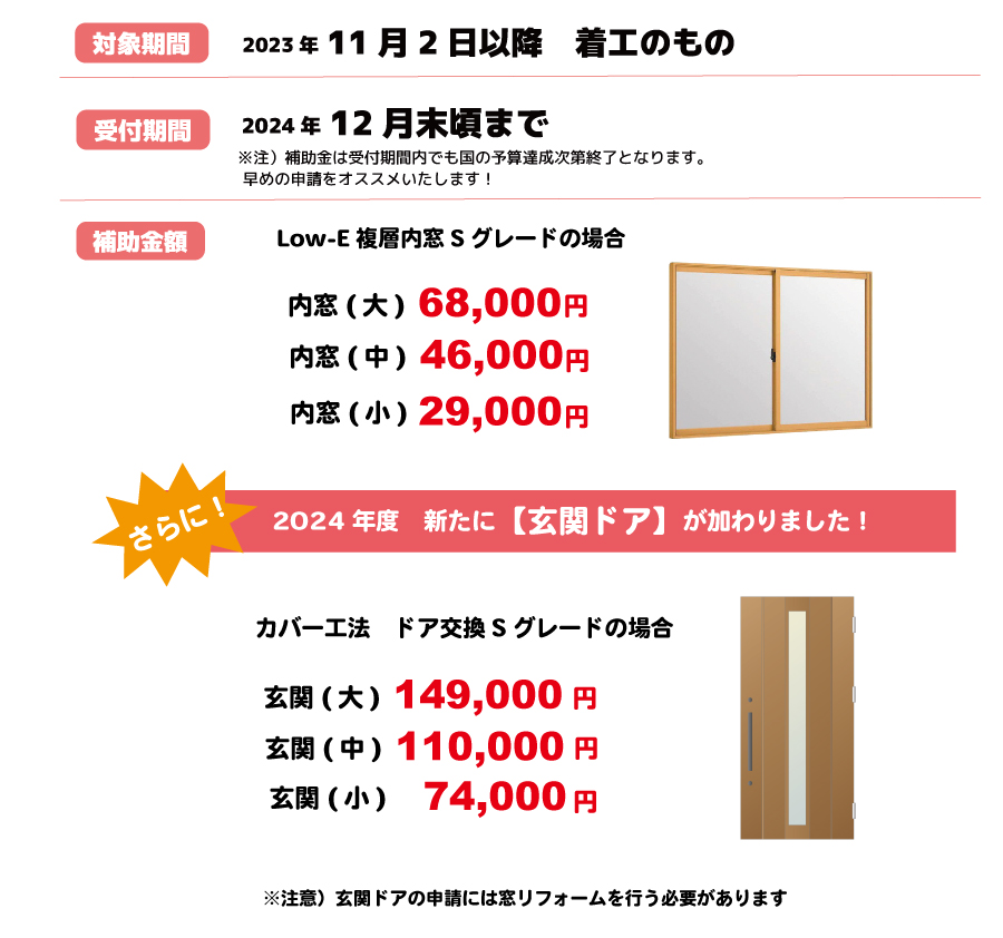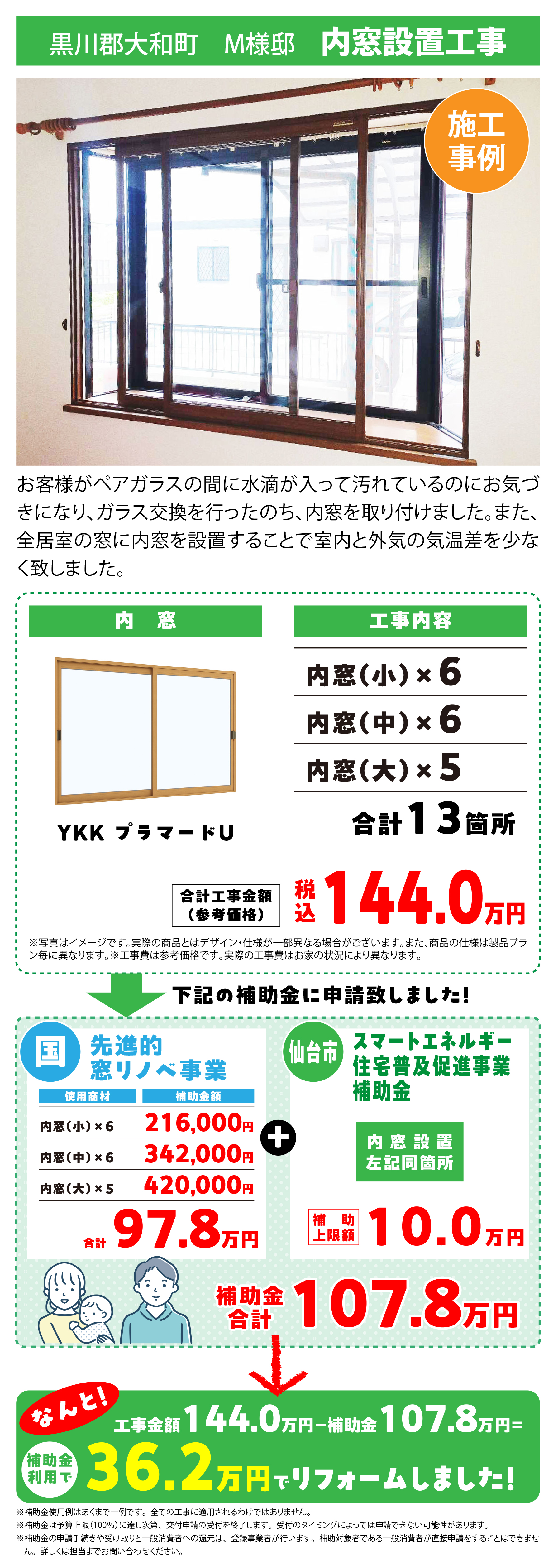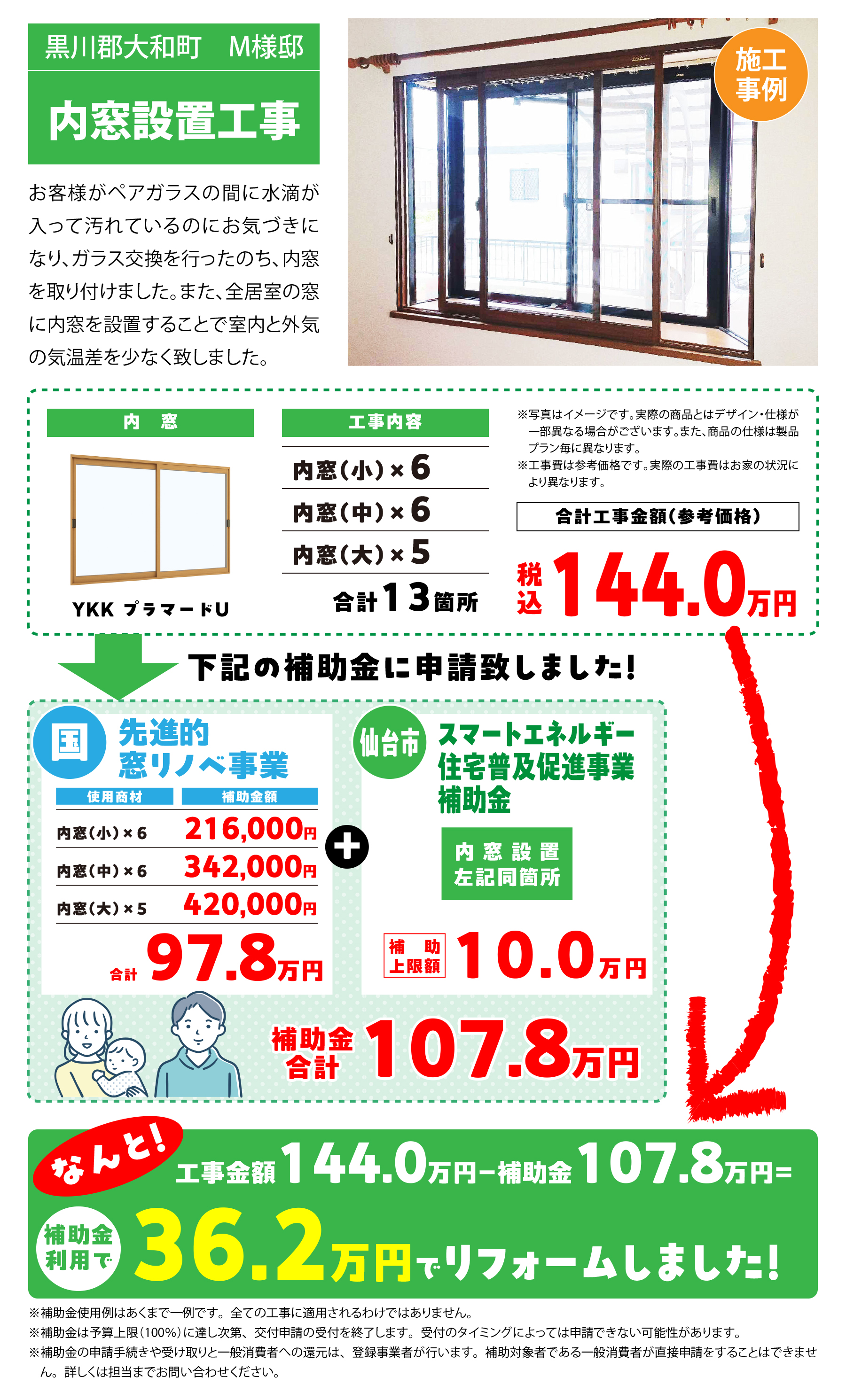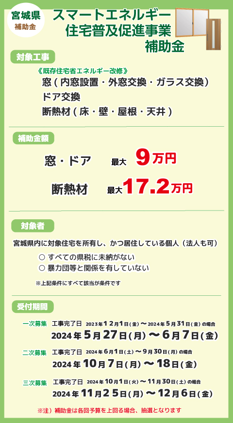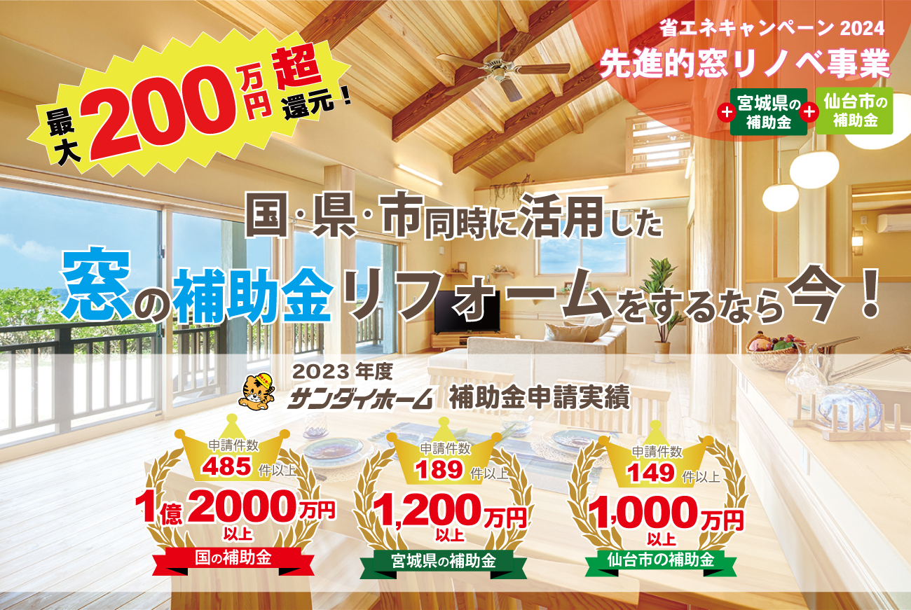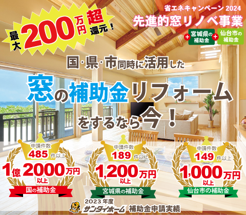 無料見積り・相談 電話で見積り・相談 0120-705-582 【受付】9:00~18:00【定休日】水曜日 電話で見積り・相談 HOME2024年補助金 国・県・市 同時に活用した窓リフォームができる! 先進的窓リノベ2024事業は、断熱窓への改修を促進し既存住宅の省エネ化を促すことで、エネルギー費用負担の軽減、健康で快適なくらしの実現及び家庭からのCO2排出削減に貢献するとともに、断熱窓の生産効率向上による関連産業の競争力強化と成長を実現させることを目的とする事業です。サンダイホームは窓や玄関ドアなど開口部のリフォーム実績大多数!お見積り無料。 補助金申請も一貫して行っておりますので興味のある方はお気軽にご相談ください。 サンダイホームおすすめ内窓 サンダイホームおすすめ内窓 他、内窓商品ページはこちら 内窓リフォーム例 内窓リフォーム例 窓リフォーム施工事例 さらに断熱性能を高めるのにおススメです! おすすめ玄関ドア 他 おすすめリフォーム例 他 おすすめリフォーム例 各種お問い合わせ 住まいのお悩み相談はこちらから 電話で相談する 自宅から相談する すぐにお悩みを解決 リフォームで最後までサポート WEBで相談する WEBから気軽に相談可能 オンライン相談も可能! 現状調査や見積もり依頼にも対応 ショールームで相談する 実際の商品を見ながら確認が可能 資料と合わせて説明を聞くことが可能 実際のリフォーム現場が見られる - トップに戻る - サンダイホーム・グループ サンダイ本社 サンダイ本社宮城県仙台市泉区長命ケ丘6-15-10 | 0120-70-5582 泉・青葉ショールーム仙台市泉区長命ケ丘 6-15-10 | 0120-70-5582 宮城野・多賀城ショールーム仙台市宮城野区中野字寺前 68-1 | 0120-70-5582 岩沼・名取ショールーム岩沼市栄町 1-9-1 | 0120-70-5582 営業部 リフォーム・リノベーション・新築仙台市泉区長命ケ丘 6-15-10 | 0120-70-5582 ライフサポート仙台市泉区長命ケ丘 6-15-10 | 0120-70-5582 解体仙台市泉区南中山 2-3-12 | 0120-70-5582 不動産仙台市泉区長命ケ丘 6-15-10 | 0120-70-5582 [統括管理会社]株式会社サンダイホーム|仙台市泉区長命ケ丘6-15-10|022-341-5152 [施工管理会社]株式会社住環境テック|仙台市泉区長命ケ丘6-15-10|022-341-5417