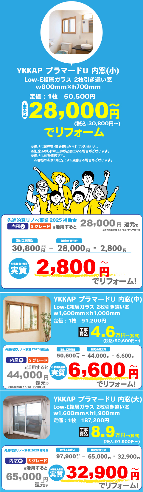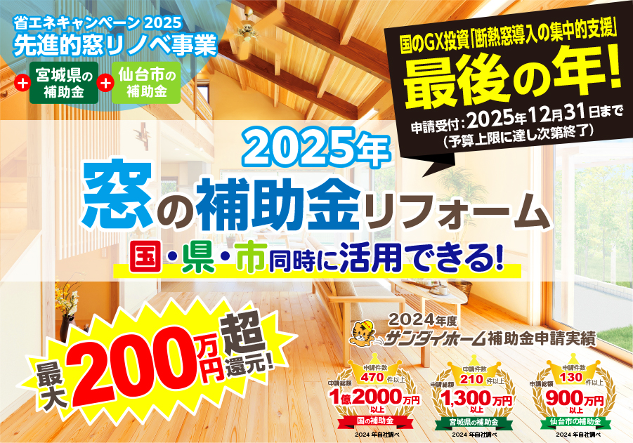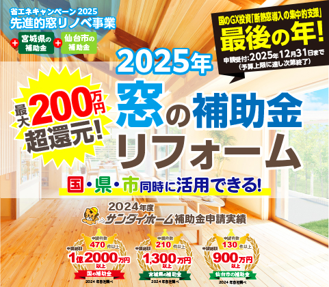 無料見積り・相談 電話で見積り・相談 0120-705-582 【受付】9:00~18:00【定休日】水曜日 電話で見積り・相談 HOME2025年 窓の補助金 国・県・市を活用して窓リフォームができる! 先進的窓リノベ2025事業は、断熱窓への改修を促進し既存住宅の省エネ化を促すことで、エネルギー費用負担の軽減、健康で快適なくらしの実現及び家庭からのCO2排出削減に貢献するとともに、断熱窓の生産効率向上による関連産業の競争力強化と成長を実現させることを目的とする事業です。サンダイホームは窓や玄関ドアなど開口部のリフォームの豊富な実績と経験がございます!お見積り無料。 補助金申請も一貫して行っておりますので興味のある方はお気軽にご相談ください。 サンダイホームおすすめ内窓 他、内窓商品ページはこちら 先進的窓リノベ2025事業 概要 窓リフォーム施工事例 各種お問い合わせ 住まいのお悩み相談はこちらから 電話で相談する 自宅から相談する すぐにお悩みを解決 リフォームで最後までサポート WEBで相談する WEBから気軽に相談可能 オンライン相談も可能! 現状調査や見積もり依頼にも対応 ショールームで相談する 実際の商品を見ながら確認が可能 資料と合わせて説明を聞くことが可能 実際のリフォーム現場が見られる - トップに戻る - サンダイホーム・グループ サンダイ本社 サンダイ本社宮城県仙台市泉区長命ケ丘6-15-10 | 0120-70-5582 泉・青葉ショールーム仙台市泉区長命ケ丘 6-15-10 | 0120-70-5582 宮城野・多賀城ショールーム仙台市宮城野区中野字寺前 68-1 | 0120-70-5582 岩沼・名取ショールーム岩沼市栄町 1-9-1 | 0120-70-5582 営業部 リフォーム・リノベーション・新築仙台市泉区長命ケ丘 6-15-10 | 0120-70-5582 ライフサポート仙台市泉区長命ケ丘 6-15-10 | 0120-70-5582 解体仙台市泉区南中山 2-3-12 | 0120-70-5582 不動産仙台市泉区長命ケ丘 6-15-10 | 0120-70-5582 [統括管理会社]株式会社サンダイホーム|仙台市泉区長命ケ丘6-15-10|022-341-5152 [施工管理会社]株式会社住環境テック|仙台市泉区長命ケ丘6-15-10|022-341-5417