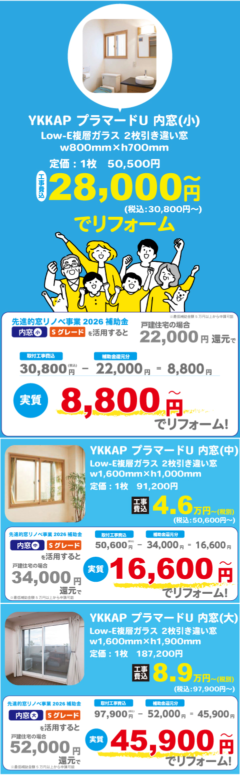 無料見積り・相談 電話で見積り・相談 0120-705-582 【受付】9:00~18:00【定休日】水曜日 電話で見積り・相談 HOME2026年 窓の補助金リフォーム 先進的窓リノベ2026事業は、断熱窓への改修を促進し既存住宅の省エネ化を促すことで、エネルギー費用負担の軽減、健康で快適なくらしの実現及び家庭からのCO2排出削減に貢献するとともに、断熱窓の生産効率向上による関連産業の競争力強化と成長を実現させることを目的とする事業です。サンダイホームは窓や玄関ドアなど開口部のリフォームの豊富な実績と経験がございます!お見積り無料。 補助金申請も一貫して行っておりますので興味のある方はお気軽にご相談ください。 サンダイホームおすすめ内窓 サンダイホームおすすめ内窓 他、内窓商品ページはこちら 先進的窓リノベ2026事業 概要 先進的窓リノベ2026事業 概要 窓リフォーム施工事例 各種お問い合わせ 住まいのお悩み相談はこちらから 電話で相談する 自宅から相談する すぐにお悩みを解決 リフォームで最後までサポート WEBで相談する WEBから気軽に相談可能 オンライン相談も可能! 現状調査や見積もり依頼にも対応 ショールームで相談する 実際の商品を見ながら確認が可能 資料と合わせて説明を聞くことが可能 実際のリフォーム現場が見られる - トップに戻る - サンダイホーム・グループ サンダイ本社 サンダイ本社宮城県仙台市泉区長命ケ丘6-15-10 | 0120-70-5582 泉・青葉ショールーム仙台市泉区長命ケ丘 6-15-10 | 0120-70-5582 宮城野・多賀城ショールーム仙台市宮城野区中野字寺前 68-1 | 0120-70-5582 岩沼・名取ショールーム岩沼市栄町 1-9-1 | 0120-70-5582 営業部 リフォーム・リノベーション・新築仙台市泉区長命ケ丘 6-15-10 | 0120-70-5582 ライフサポート仙台市泉区長命ケ丘 6-15-10 | 0120-70-5582 解体仙台市泉区南中山 2-3-12 | 0120-70-5582 不動産仙台市泉区長命ケ丘 6-15-10 | 0120-70-5582 [統括管理会社]株式会社サンダイホーム|仙台市泉区長命ケ丘6-15-10|022-341-5152 [施工管理会社]株式会社住環境テック|仙台市泉区長命ケ丘6-15-10|022-341-5417