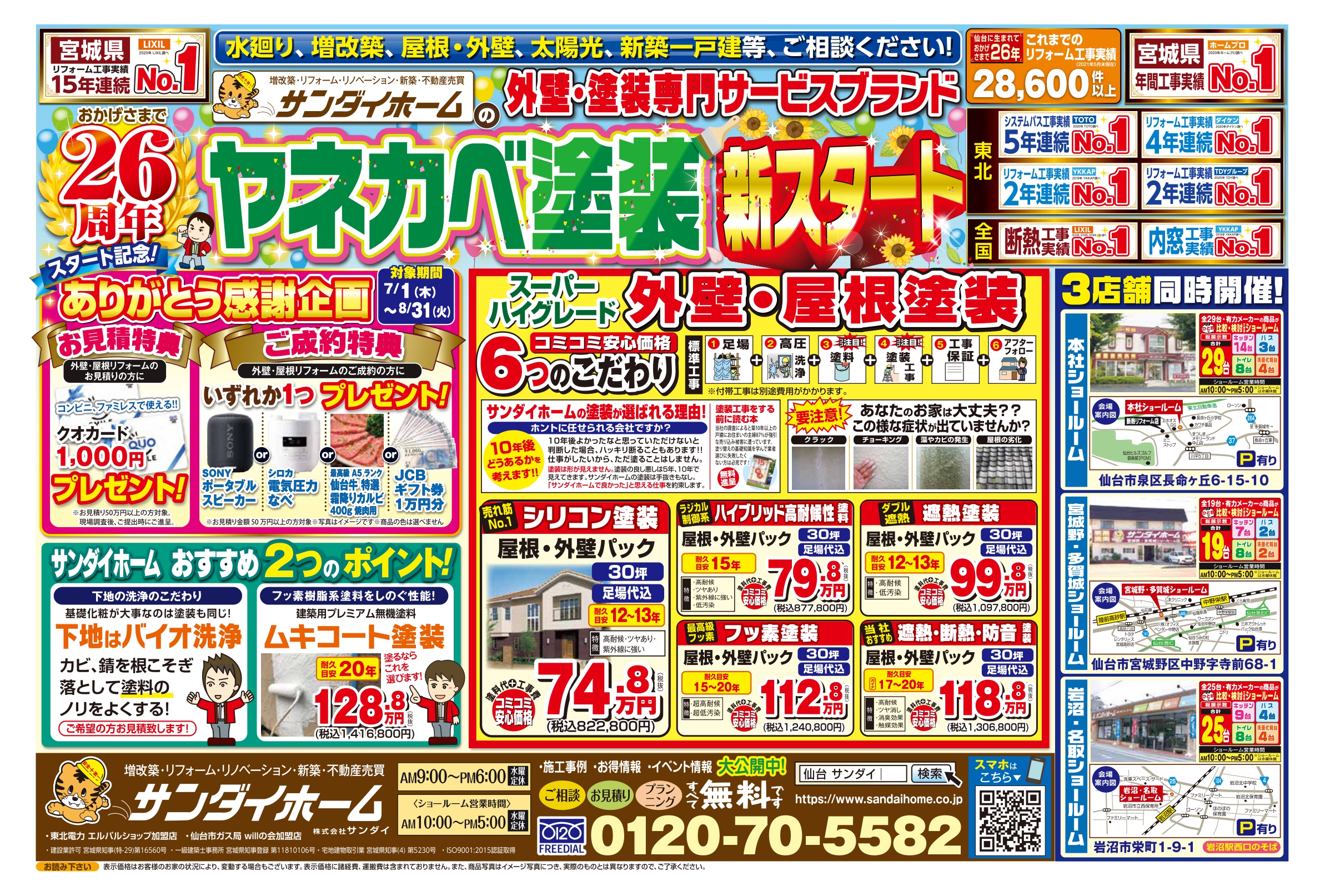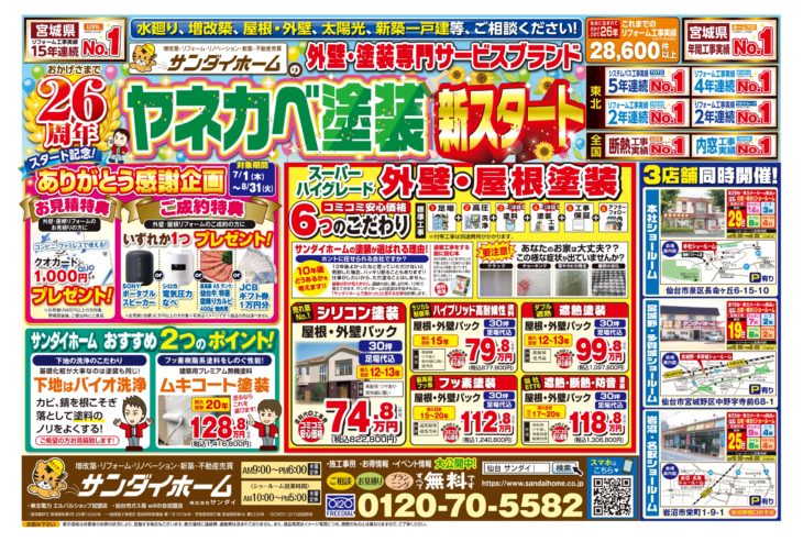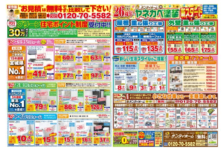 無料見積り・相談 電話で見積り・相談 0120-705-582 【受付】9:00~18:00【定休日】水曜日 電話で見積り・相談 HOMEリフォームコラム定番チラシ2021年7月~8月末まで有効 定番チラシ 2021年7月~8月末まで有効 定番チラシ 投稿日: 2021年7月8日 カテゴリー:定番チラシ 平素は格別のご厚情を賜り、厚く御礼申し上げます。 2021年7月~8月末まで有効 定番チラシが完成致しました。 サンダイホームでは新商品、ヤネカベ塗装を始めました。 そのほか、水廻り商品や定番メニュー等見ごたえ十分のチラシとなっております。 また、弊社ではお客様に安心してご来場いただけるよう 各ショールームに於いて三密対策を徹底いたしております。 気になる商品等ございましたらお気軽にお問い合わせください。 定番チラシ リフォームコラム一覧 最新の投稿 年末年始休業のお知らせ 【速報】国の補助金2026年度版が発表されました 夏季休業のお知らせ ゴールデンウィーク休業のお知らせ 【お知らせ】「サンダイホーム」と「東北電力」は リフォーム・リノベーション事業で業務提携します! 【速報】国水廻り補助金 子育てグリーン住宅支援事業詳細が発表されました 【泉・青葉ショールーム】新しいキッチン入荷しました 【泉・青葉ショールーム】新しいキッチン入荷しました 年末年始休業のお知らせ 【泉・青葉ショールーム】新しいキッチン入荷しました カテゴリー 展示品 (5) イベントチラシ (1) お知らせ (30) 定番チラシ (18) コラム (4) その他 (1) 月別アーカイブ 2025年12月 (1) 2025年11月 (1) 2025年8月 (1) 2025年4月 (1) 2025年2月 (3) 2024年12月 (4) 2024年11月 (2) 2024年10月 (2) 2024年8月 (2) 2024年6月 (1) 2024年5月 (1) 2024年4月 (2) サンダイホームについて サンダイの10のこだわり 会社案内代表挨拶会社概要企業理念店舗情報 リフォームの流れ よくある質問 サンダイホームの受賞実績 補助金・助成金について 震災への取り組み プライバシーポリシー 新築施工事例 施工事例一覧 補助金活用リフォーム リノベーション 増改築リフォーム マンション 新築 キッチンリフォーム 浴室リフォーム 給湯器・エコキュート トイレリフォーム 洗面リフォーム 窓・玄関 内装リフォーム 外壁・屋根リフォーム 塗装リフォーム 外構リフォーム お客様の声 お客様の声一覧 イベント情報 イベント情報一覧リフォームメニュー お買い得商品 LIXIL サンダイオリジナルシャワートイレ(チラシ掲載商品) ¥114,000~(税込) ショールーム展示 TOTO サザナHTシリーズ Sタイプ(宮城野・多賀城店展示) ¥1,028,000~(税込) 内窓リフォーム YKKAP プラマードU 2枚建引違い(Low-E複層ガラス) 小サイズ ¥30,000円~(税込) 玄関ドアリフォーム YKKAP 高断熱玄関ドア ドアリモ D30(チラシ掲載商品) ¥234,000円~(税込) キッチンリフォーム LIXIL シエラS(チラシ掲載商品) ¥605,000~(税込) 浴室リフォーム TOTO サザナHTシリーズ Nタイプ(チラシ掲載商品) ¥848,000~(税込) トイレリフォーム LIXIL サンダイオリジナルシャワートイレ(チラシ掲載商品) ¥114,000~(税込) 洗面化粧台リフォーム LIXIL ピアラ( 2店舗展示) ¥171,000~(税込) 給湯器リフォーム Paloma エコジョーズ ¥128,000円~(税込) シャッター・雨戸 LIXIL リフォームシャッター 手動標準タイプ(チラシ掲載商品) ¥119,000円~(税込) リフォームメニュー一覧 お買い得商品 ショールーム展示 内窓リフォーム 玄関ドアリフォーム キッチンリフォーム 浴室リフォーム トイレリフォーム 洗面化粧台リフォーム 給湯器リフォーム シャッター・雨戸 お役立ち情報 ショールーム紹介 不動産情報 各種お問い合わせ お問い合わせ 無料お見積もり 資料請求 イベント参加 各種お問い合わせ 住まいのお悩み相談はこちらから 電話で相談する 自宅から相談する すぐにお悩みを解決 リフォームで最後までサポート WEBで相談する WEBから気軽に相談可能 オンライン相談も可能! 現状調査や見積もり依頼にも対応 ショールームで相談する 実際の商品を見ながら確認が可能 資料と合わせて説明を聞くことが可能 実際のリフォーム現場が見られる - トップに戻る - サンダイホーム・グループ サンダイ本社 サンダイ本社宮城県仙台市泉区長命ケ丘6-15-10 | 0120-70-5582 泉・青葉ショールーム仙台市泉区長命ケ丘 6-15-10 | 0120-70-5582 宮城野・多賀城ショールーム仙台市宮城野区中野字寺前 68-1 | 0120-70-5582 岩沼・名取ショールーム岩沼市栄町 1-9-1 | 0120-70-5582 営業部 リフォーム・リノベーション・新築仙台市泉区長命ケ丘 6-15-10 | 0120-70-5582 ライフサポート仙台市泉区長命ケ丘 6-15-10 | 0120-70-5582 解体仙台市泉区南中山 2-3-12 | 0120-70-5582 不動産仙台市泉区長命ケ丘 6-15-10 | 0120-70-5582 [統括管理会社]株式会社サンダイホーム|仙台市泉区長命ケ丘6-15-10|022-341-5152 [施工管理会社]株式会社住環境テック|仙台市泉区長命ケ丘6-15-10|022-341-5417
