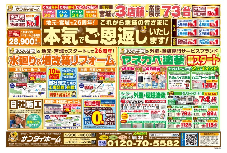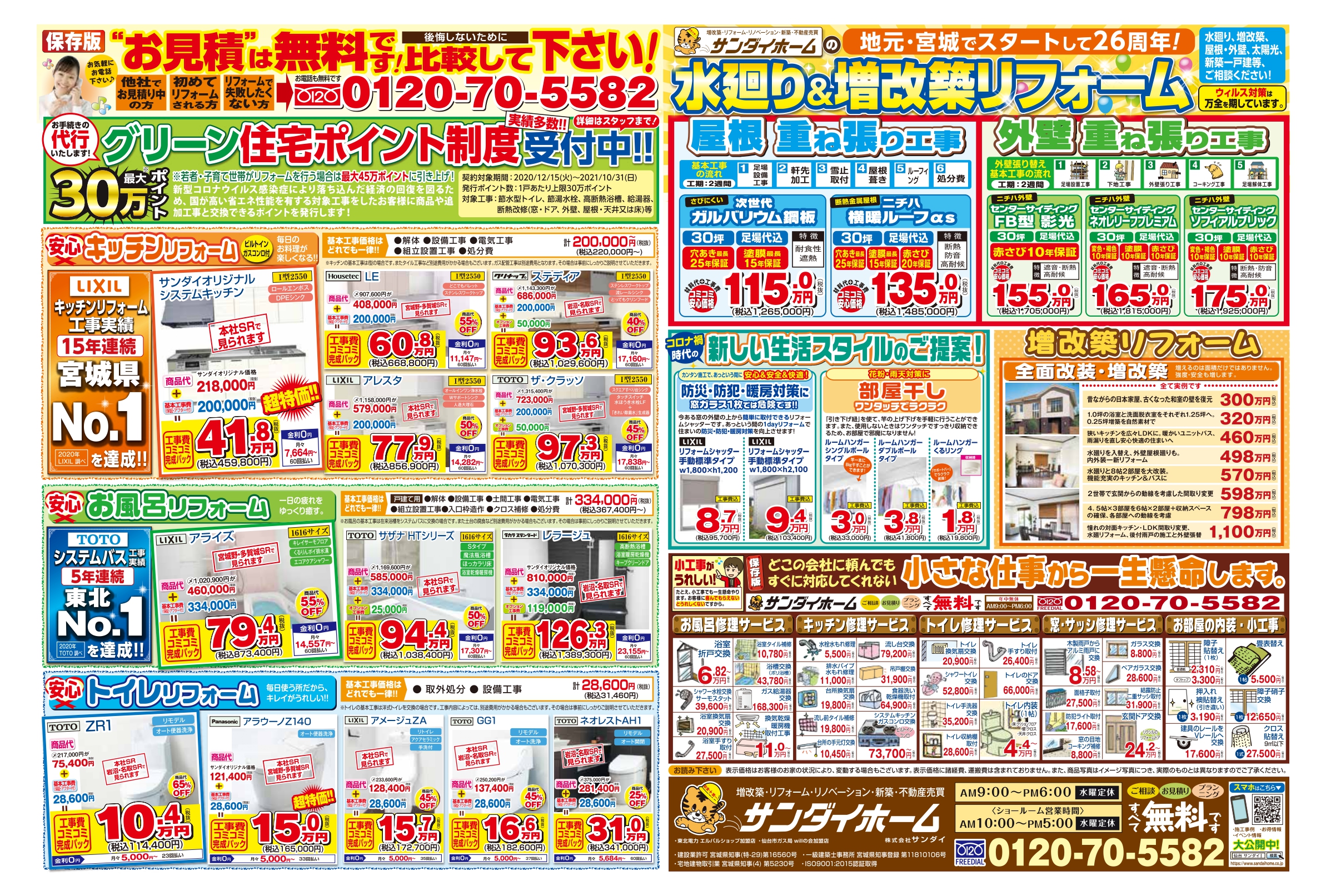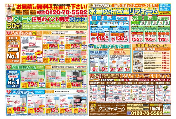 無料見積り・相談 電話で見積り・相談 0120-705-582 【受付】9:00~18:00【定休日】水曜日 電話で見積り・相談 HOMEリフォームコラム定番チラシ2021年9月~11月末まで有効 定番チラシ 2021年9月~11月末まで有効 定番チラシ 投稿日: 2021年9月2日 カテゴリー:定番チラシ 平素は格別のご厚情を賜り、厚く御礼申し上げます。 2021年9月~11月末まで有効 定番チラシが完成致しました。 サンダイホームでは新商品、ヤネカベ塗装を始めました。 そのほか、水廻り商品や定番メニュー等見ごたえ十分のチラシとなっております。 また、弊社ではお客様に安心してご来場いただけるよう 各ショールームに於いて三密対策を徹底いたしております。 気になる商品等ございましたらお気軽にお問い合わせください。 定番チラシ リフォームコラム一覧 最新の投稿 年末年始休業のお知らせ 【速報】国の補助金2026年度版が発表されました 夏季休業のお知らせ ゴールデンウィーク休業のお知らせ 【お知らせ】「サンダイホーム」と「東北電力」は リフォーム・リノベーション事業で業務提携します! 【速報】国水廻り補助金 子育てグリーン住宅支援事業詳細が発表されました 【泉・青葉ショールーム】新しいキッチン入荷しました 【泉・青葉ショールーム】新しいキッチン入荷しました 年末年始休業のお知らせ 【泉・青葉ショールーム】新しいキッチン入荷しました カテゴリー 展示品 (5) イベントチラシ (1) お知らせ (30) 定番チラシ (18) コラム (4) その他 (1) 月別アーカイブ 2025年12月 (1) 2025年11月 (1) 2025年8月 (1) 2025年4月 (1) 2025年2月 (3) 2024年12月 (4) 2024年11月 (2) 2024年10月 (2) 2024年8月 (2) 2024年6月 (1) 2024年5月 (1) 2024年4月 (2) サンダイホームについて サンダイの10のこだわり 会社案内代表挨拶会社概要企業理念店舗情報 リフォームの流れ よくある質問 サンダイホームの受賞実績 補助金・助成金について 震災への取り組み プライバシーポリシー 新築施工事例 施工事例一覧 補助金活用リフォーム リノベーション 増改築リフォーム マンション 新築 キッチンリフォーム 浴室リフォーム 給湯器・エコキュート トイレリフォーム 洗面リフォーム 窓・玄関 内装リフォーム 外壁・屋根リフォーム 塗装リフォーム 外構リフォーム お客様の声 お客様の声一覧 イベント情報 イベント情報一覧リフォームメニュー お買い得商品 LIXIL サンダイオリジナルシャワートイレ(チラシ掲載商品) ¥114,000~(税込) ショールーム展示 TOTO サザナHTシリーズ Sタイプ(宮城野・多賀城店展示) ¥1,028,000~(税込) 内窓リフォーム YKKAP プラマードU 2枚建引違い(Low-E複層ガラス) 小サイズ ¥30,000円~(税込) 玄関ドアリフォーム YKKAP 高断熱玄関ドア ドアリモ D30(チラシ掲載商品) ¥234,000円~(税込) キッチンリフォーム LIXIL シエラS(チラシ掲載商品) ¥605,000~(税込) 浴室リフォーム TOTO サザナHTシリーズ Nタイプ(チラシ掲載商品) ¥848,000~(税込) トイレリフォーム LIXIL サンダイオリジナルシャワートイレ(チラシ掲載商品) ¥114,000~(税込) 洗面化粧台リフォーム LIXIL ピアラ( 2店舗展示) ¥171,000~(税込) 給湯器リフォーム Paloma エコジョーズ ¥128,000円~(税込) シャッター・雨戸 LIXIL リフォームシャッター 手動標準タイプ(チラシ掲載商品) ¥119,000円~(税込) リフォームメニュー一覧 お買い得商品 ショールーム展示 内窓リフォーム 玄関ドアリフォーム キッチンリフォーム 浴室リフォーム トイレリフォーム 洗面化粧台リフォーム 給湯器リフォーム シャッター・雨戸 お役立ち情報 ショールーム紹介 不動産情報 各種お問い合わせ お問い合わせ 無料お見積もり 資料請求 イベント参加 各種お問い合わせ 住まいのお悩み相談はこちらから 電話で相談する 自宅から相談する すぐにお悩みを解決 リフォームで最後までサポート WEBで相談する WEBから気軽に相談可能 オンライン相談も可能! 現状調査や見積もり依頼にも対応 ショールームで相談する 実際の商品を見ながら確認が可能 資料と合わせて説明を聞くことが可能 実際のリフォーム現場が見られる - トップに戻る - サンダイホーム・グループ サンダイ本社 サンダイ本社宮城県仙台市泉区長命ケ丘6-15-10 | 0120-70-5582 泉・青葉ショールーム仙台市泉区長命ケ丘 6-15-10 | 0120-70-5582 宮城野・多賀城ショールーム仙台市宮城野区中野字寺前 68-1 | 0120-70-5582 岩沼・名取ショールーム岩沼市栄町 1-9-1 | 0120-70-5582 営業部 リフォーム・リノベーション・新築仙台市泉区長命ケ丘 6-15-10 | 0120-70-5582 ライフサポート仙台市泉区長命ケ丘 6-15-10 | 0120-70-5582 解体仙台市泉区南中山 2-3-12 | 0120-70-5582 不動産仙台市泉区長命ケ丘 6-15-10 | 0120-70-5582 [統括管理会社]株式会社サンダイホーム|仙台市泉区長命ケ丘6-15-10|022-341-5152 [施工管理会社]株式会社住環境テック|仙台市泉区長命ケ丘6-15-10|022-341-5417