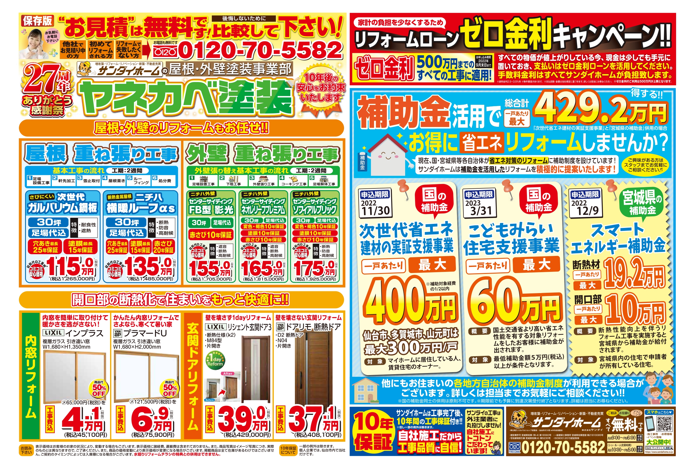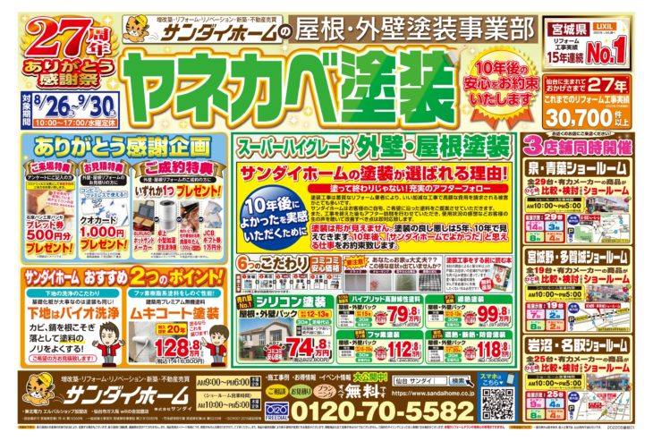 無料見積り・相談 電話で見積り・相談 0120-705-582 【受付】9:00~18:00【定休日】水曜日 電話で見積り・相談 HOMEリフォームコラム定番チラシ8月26日~9月30日まで有効 ヤネカベ塗装チラシ 8月26日~9月30日まで有効 ヤネカベ塗装チラシ 投稿日: 2022年8月6日 カテゴリー:定番チラシ 平素は格別のご厚情を賜り、厚く御礼申し上げます。2022年8月26日~9月30日まで有効 ヤネカベ塗装定番チラシが完成致しました。現在、国や宮城県等各自治体が省エネリフォームに補助制度を設けております!サンダイホームでは少しでもお客様がお得にリフォームができるように、補助金を活用したリフォーム等、お客様のご要望に沿ったご提案をさせていただきます。各ショールームではお客様に安心してご来場いただけるよう三密対策を徹底いたしております。気になる商品等ございましたらお気軽にお問い合わせください。 定番チラシ リフォームコラム一覧 最新の投稿 年末年始休業のお知らせ 【速報】国の補助金2026年度版が発表されました 夏季休業のお知らせ ゴールデンウィーク休業のお知らせ 【お知らせ】「サンダイホーム」と「東北電力」は リフォーム・リノベーション事業で業務提携します! 【速報】国水廻り補助金 子育てグリーン住宅支援事業詳細が発表されました 【泉・青葉ショールーム】新しいキッチン入荷しました 【泉・青葉ショールーム】新しいキッチン入荷しました 年末年始休業のお知らせ 【泉・青葉ショールーム】新しいキッチン入荷しました カテゴリー 展示品 (5) イベントチラシ (1) お知らせ (30) 定番チラシ (18) コラム (4) その他 (1) 月別アーカイブ 2025年12月 (1) 2025年11月 (1) 2025年8月 (1) 2025年4月 (1) 2025年2月 (3) 2024年12月 (4) 2024年11月 (2) 2024年10月 (2) 2024年8月 (2) 2024年6月 (1) 2024年5月 (1) 2024年4月 (2) サンダイホームについて サンダイの10のこだわり 会社案内代表挨拶会社概要企業理念店舗情報 リフォームの流れ よくある質問 サンダイホームの受賞実績 補助金・助成金について 震災への取り組み プライバシーポリシー 新築施工事例 施工事例一覧 補助金活用リフォーム リノベーション 増改築リフォーム マンション 新築 キッチンリフォーム 浴室リフォーム 給湯器・エコキュート トイレリフォーム 洗面リフォーム 窓・玄関 内装リフォーム 外壁・屋根リフォーム 塗装リフォーム 外構リフォーム お客様の声 お客様の声一覧 イベント情報 イベント情報一覧リフォームメニュー お買い得商品 LIXIL サンダイオリジナルシャワートイレ(チラシ掲載商品) ¥114,000~(税込) ショールーム展示 TOTO サザナHTシリーズ Sタイプ(宮城野・多賀城店展示) ¥1,028,000~(税込) 内窓リフォーム YKKAP プラマードU 2枚建引違い(Low-E複層ガラス) 小サイズ ¥30,000円~(税込) 玄関ドアリフォーム YKKAP 高断熱玄関ドア ドアリモ D30(チラシ掲載商品) ¥234,000円~(税込) キッチンリフォーム LIXIL シエラS(チラシ掲載商品) ¥605,000~(税込) 浴室リフォーム TOTO サザナHTシリーズ Nタイプ(チラシ掲載商品) ¥848,000~(税込) トイレリフォーム LIXIL サンダイオリジナルシャワートイレ(チラシ掲載商品) ¥114,000~(税込) 洗面化粧台リフォーム LIXIL ピアラ( 2店舗展示) ¥171,000~(税込) 給湯器リフォーム Paloma エコジョーズ ¥128,000円~(税込) シャッター・雨戸 LIXIL リフォームシャッター 手動標準タイプ(チラシ掲載商品) ¥119,000円~(税込) リフォームメニュー一覧 お買い得商品 ショールーム展示 内窓リフォーム 玄関ドアリフォーム キッチンリフォーム 浴室リフォーム トイレリフォーム 洗面化粧台リフォーム 給湯器リフォーム シャッター・雨戸 お役立ち情報 ショールーム紹介 不動産情報 各種お問い合わせ お問い合わせ 無料お見積もり 資料請求 イベント参加 各種お問い合わせ 住まいのお悩み相談はこちらから 電話で相談する 自宅から相談する すぐにお悩みを解決 リフォームで最後までサポート WEBで相談する WEBから気軽に相談可能 オンライン相談も可能! 現状調査や見積もり依頼にも対応 ショールームで相談する 実際の商品を見ながら確認が可能 資料と合わせて説明を聞くことが可能 実際のリフォーム現場が見られる - トップに戻る - サンダイホーム・グループ サンダイ本社 サンダイ本社宮城県仙台市泉区長命ケ丘6-15-10 | 0120-70-5582 泉・青葉ショールーム仙台市泉区長命ケ丘 6-15-10 | 0120-70-5582 宮城野・多賀城ショールーム仙台市宮城野区中野字寺前 68-1 | 0120-70-5582 岩沼・名取ショールーム岩沼市栄町 1-9-1 | 0120-70-5582 営業部 リフォーム・リノベーション・新築仙台市泉区長命ケ丘 6-15-10 | 0120-70-5582 ライフサポート仙台市泉区長命ケ丘 6-15-10 | 0120-70-5582 解体仙台市泉区南中山 2-3-12 | 0120-70-5582 不動産仙台市泉区長命ケ丘 6-15-10 | 0120-70-5582 [統括管理会社]株式会社サンダイホーム|仙台市泉区長命ケ丘6-15-10|022-341-5152 [施工管理会社]株式会社住環境テック|仙台市泉区長命ケ丘6-15-10|022-341-5417