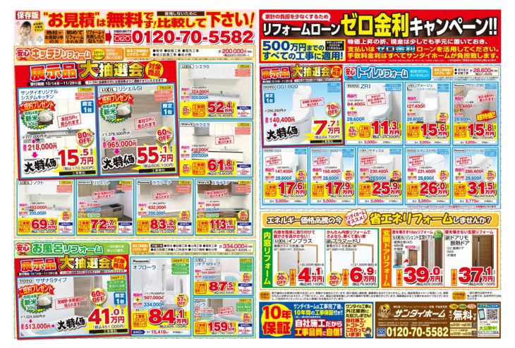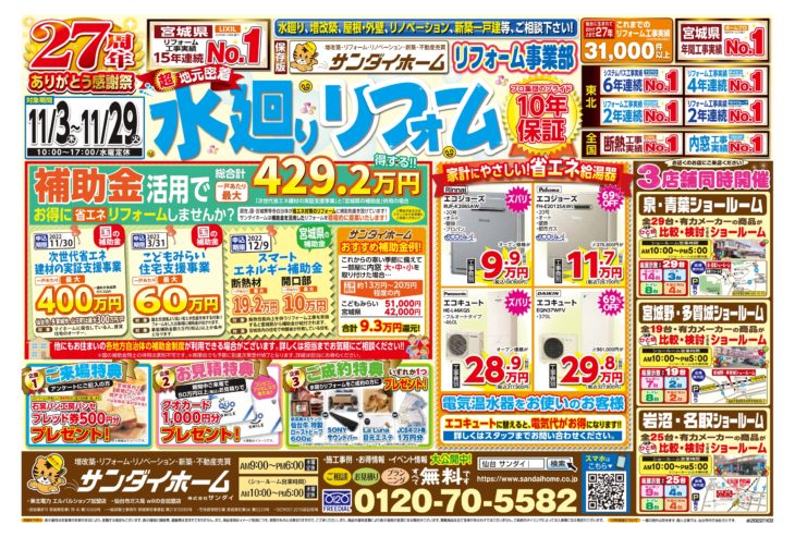 無料見積り・相談 電話で見積り・相談 0120-705-582 【受付】9:00~18:00【定休日】水曜日 電話で見積り・相談 HOMEリフォームコラム定番チラシ11月3日~29日まで有効 水廻り定番チラシ 11月3日~29日まで有効 水廻り定番チラシ 投稿日: 2022年10月25日 カテゴリー:定番チラシ 平素は格別のご厚情を賜り、厚く御礼申し上げます。 2022年11月3日~29日まで有効 水廻り定番チラシが完成致しました。 現在、国や宮城県・各地方自治体が省エネリフォームに補助制度を設けております!サンダイホームでは少しでもお客様がお得にリフォームができるように、補助金を活用したリフォーム等、お客様のご要望に沿ったご提案をさせていただきます。また、展示品入替に伴い、最大80%OFFの「展示商品入替大抽選会」を好評開催中です。欲しかったあの商品がお得な価格で手に入るチャンスです。この機会をお見逃しなく!各ショールームではお客様に安心してご来場いただけるよう三密対策を徹底いたしております。 気になる商品等ございましたらお気軽にお問い合わせください。 定番チラシ リフォームコラム一覧 最新の投稿 年末年始休業のお知らせ 【速報】国の補助金2026年度版が発表されました 夏季休業のお知らせ ゴールデンウィーク休業のお知らせ 【お知らせ】「サンダイホーム」と「東北電力」は リフォーム・リノベーション事業で業務提携します! 【速報】国水廻り補助金 子育てグリーン住宅支援事業詳細が発表されました 【泉・青葉ショールーム】新しいキッチン入荷しました 【泉・青葉ショールーム】新しいキッチン入荷しました 年末年始休業のお知らせ 【泉・青葉ショールーム】新しいキッチン入荷しました カテゴリー 展示品 (5) イベントチラシ (1) お知らせ (30) 定番チラシ (18) コラム (4) その他 (1) 月別アーカイブ 2025年12月 (1) 2025年11月 (1) 2025年8月 (1) 2025年4月 (1) 2025年2月 (3) 2024年12月 (4) 2024年11月 (2) 2024年10月 (2) 2024年8月 (2) 2024年6月 (1) 2024年5月 (1) 2024年4月 (2) サンダイホームについて サンダイの10のこだわり 会社案内代表挨拶会社概要企業理念店舗情報 リフォームの流れ よくある質問 サンダイホームの受賞実績 補助金・助成金について 震災への取り組み プライバシーポリシー 新築施工事例 施工事例一覧 補助金活用リフォーム リノベーション 増改築リフォーム マンション 新築 キッチンリフォーム 浴室リフォーム 給湯器・エコキュート トイレリフォーム 洗面リフォーム 窓・玄関 内装リフォーム 外壁・屋根リフォーム 塗装リフォーム 外構リフォーム お客様の声 お客様の声一覧 イベント情報 イベント情報一覧リフォームメニュー お買い得商品 LIXIL サンダイオリジナルシャワートイレ(チラシ掲載商品) ¥114,000~(税込) ショールーム展示 TOTO サザナHTシリーズ Sタイプ(宮城野・多賀城店展示) ¥1,028,000~(税込) 内窓リフォーム YKKAP プラマードU 2枚建引違い(Low-E複層ガラス) 小サイズ ¥30,000円~(税込) 玄関ドアリフォーム YKKAP 高断熱玄関ドア ドアリモ D30(チラシ掲載商品) ¥234,000円~(税込) キッチンリフォーム LIXIL シエラS(チラシ掲載商品) ¥605,000~(税込) 浴室リフォーム TOTO サザナHTシリーズ Nタイプ(チラシ掲載商品) ¥848,000~(税込) トイレリフォーム LIXIL サンダイオリジナルシャワートイレ(チラシ掲載商品) ¥114,000~(税込) 洗面化粧台リフォーム LIXIL ピアラ( 2店舗展示) ¥171,000~(税込) 給湯器リフォーム Paloma エコジョーズ ¥128,000円~(税込) シャッター・雨戸 LIXIL リフォームシャッター 手動標準タイプ(チラシ掲載商品) ¥119,000円~(税込) リフォームメニュー一覧 お買い得商品 ショールーム展示 内窓リフォーム 玄関ドアリフォーム キッチンリフォーム 浴室リフォーム トイレリフォーム 洗面化粧台リフォーム 給湯器リフォーム シャッター・雨戸 お役立ち情報 ショールーム紹介 不動産情報 各種お問い合わせ お問い合わせ 無料お見積もり 資料請求 イベント参加 各種お問い合わせ 住まいのお悩み相談はこちらから 電話で相談する 自宅から相談する すぐにお悩みを解決 リフォームで最後までサポート WEBで相談する WEBから気軽に相談可能 オンライン相談も可能! 現状調査や見積もり依頼にも対応 ショールームで相談する 実際の商品を見ながら確認が可能 資料と合わせて説明を聞くことが可能 実際のリフォーム現場が見られる - トップに戻る - サンダイホーム・グループ サンダイ本社 サンダイ本社宮城県仙台市泉区長命ケ丘6-15-10 | 0120-70-5582 泉・青葉ショールーム仙台市泉区長命ケ丘 6-15-10 | 0120-70-5582 宮城野・多賀城ショールーム仙台市宮城野区中野字寺前 68-1 | 0120-70-5582 岩沼・名取ショールーム岩沼市栄町 1-9-1 | 0120-70-5582 営業部 リフォーム・リノベーション・新築仙台市泉区長命ケ丘 6-15-10 | 0120-70-5582 ライフサポート仙台市泉区長命ケ丘 6-15-10 | 0120-70-5582 解体仙台市泉区南中山 2-3-12 | 0120-70-5582 不動産仙台市泉区長命ケ丘 6-15-10 | 0120-70-5582 [統括管理会社]株式会社サンダイホーム|仙台市泉区長命ケ丘6-15-10|022-341-5152 [施工管理会社]株式会社住