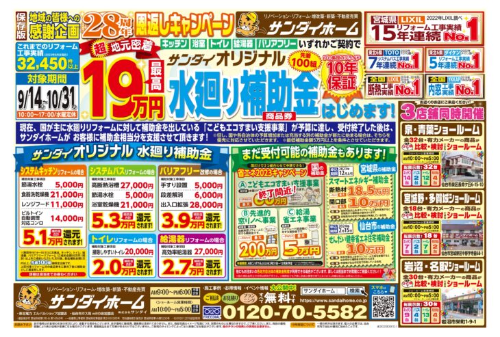 現在、国が主に水廻りリフォームに対して補助金を出している「こどもエコすまい支援事業」が予算に達し、受付終了した後は、サンダイホームがお客様に補助金相当分を支援させて頂きます!先着100組様限定企画です。詳細は担当までお尋ねください。