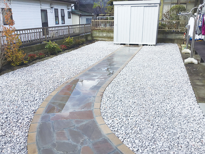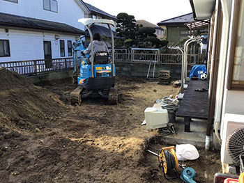 以前、外装と屋根のリフォームをさせていただきました。他社からの点検で老朽化の指摘を受けたとのことでご相談をいただき、でこぼこと生い茂った芝生を砂利かコンクリートに変えたいとのご要望でした。