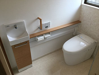 | ご提案内容 | 玄関を挟んで洗面所に入る構造だったので、トイレから洗面所側にもう一つ入り口を設け、行き来しやすいような構造をご提案いたしました。トイレにも手すりをつけて、より暮らしやすいようリフォームさせていただきました。 |